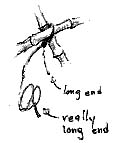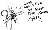 2. Wrap the twine around the two bamboo pieces once, and tie with a simple knot leaving one end of the twine about ten inches long, and the other end much longer. | ||||||||||||||