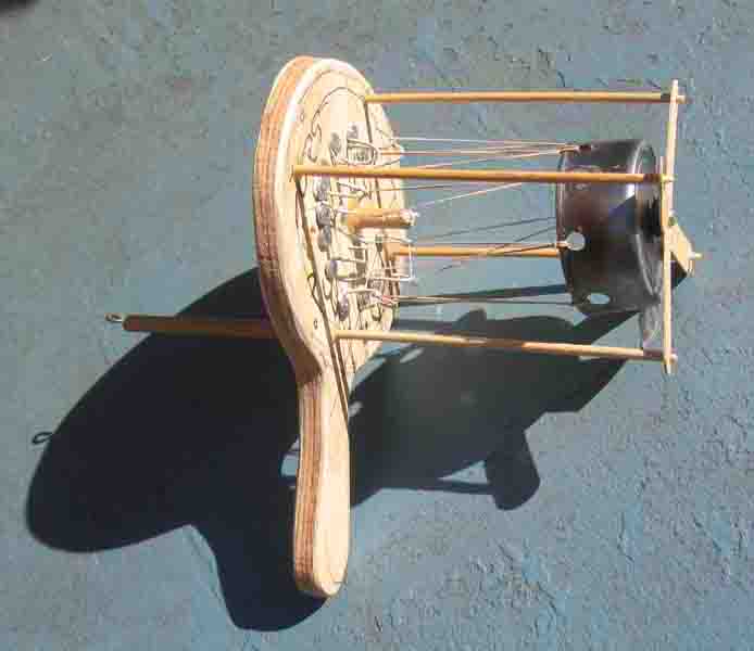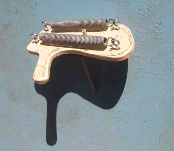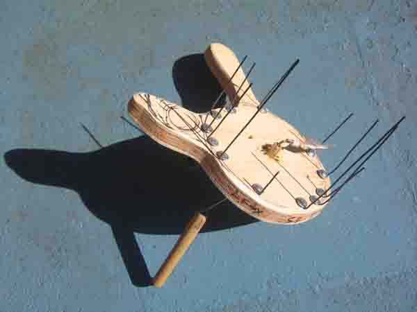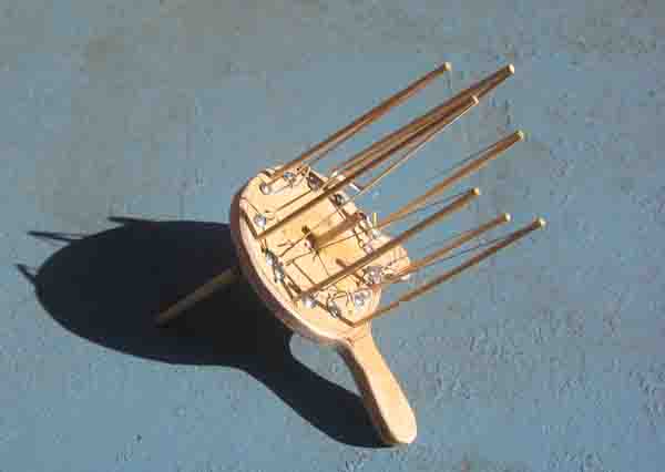 The Crank Ensemble Making New Music Seem Easy! Hear: Here I made a set of six hand-cranked instruments in the summer of 2005. There is a mount for a contact microphone (piezo) on the back of each one, so it can be amplified. Each has a hand-crank in the middle, and all but the Spring Board Hand Crank have a feather-spine that acts as a plectrum that rotates when the hand-crank is cranked. As the plectrum rotates, it plucks something that vibrates and is amplified. The "something" that vibrates is in some cases a rubber band, in some wires sticking up, in one it is a metal strip, and in another one is a heavy spring. Each has a handy handle too. |